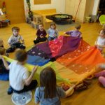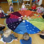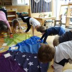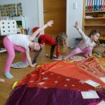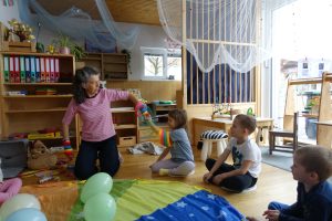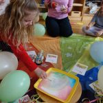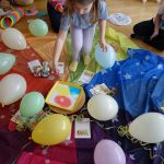 bunte Luftballon, die wir imaginär und richtig aufgeblasen haben, Luftschlangen, die fliegen ließen und auch auf besondere Art gemalt.