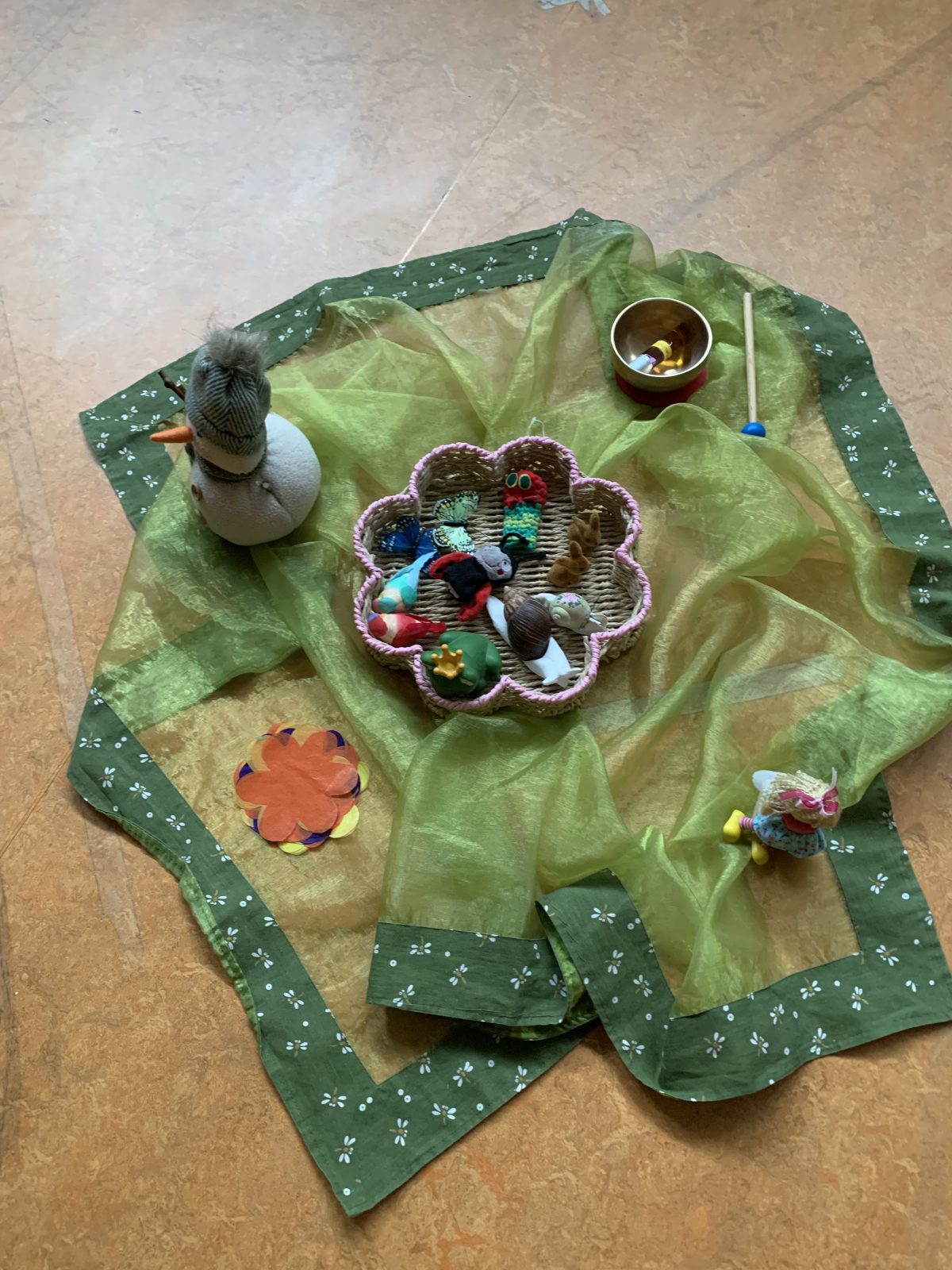 Aber langsam wird die Sonne alle wecken und unsere Asanas drehten sich um Schnecke, Frosch und Hase, Käfer und Blumen und Raupe und Schmetterling. Im Kokon ruhten wir uns aus und als Schmetterling tanzten wir unsere Runden.